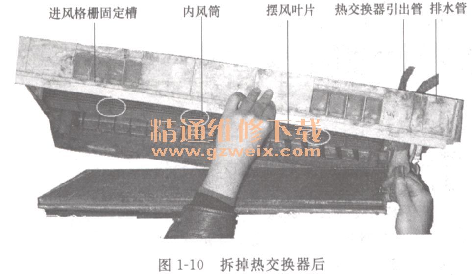 如圖1-10所示熱交換器拆卸方法,收氟→拆下室內(nèi)機(jī)→取下室溫、內(nèi)盤溫?zé)崦綦娮?rarr;手冊室內(nèi)熱交換器引出管使之與室內(nèi)機(jī)垂直(冊的次數(shù)不能超出3次)→拆下室熱交換器固定螺絲→撬開熱交換器側(cè)端的固定卡→雙手緊握熱交換器移出即一些,然后連同引出管、排水管一同取出。