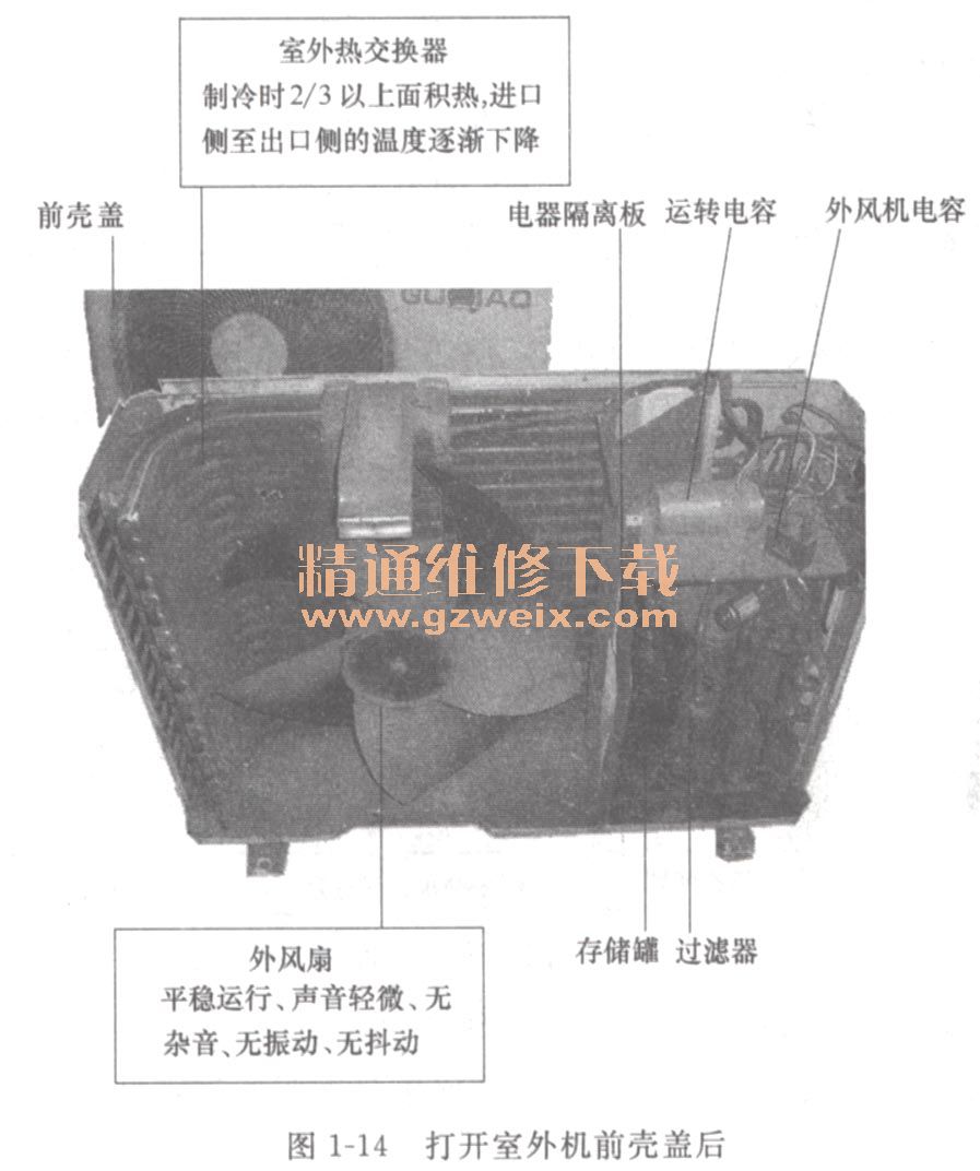 如圖1-14所示,拆卸室外機(jī)前殼所有固定螺釘,摘掉前殼,就會看到電器隔離板、室外熱交換器、外風(fēng)扇扇葉、外風(fēng)機(jī)及電容等。