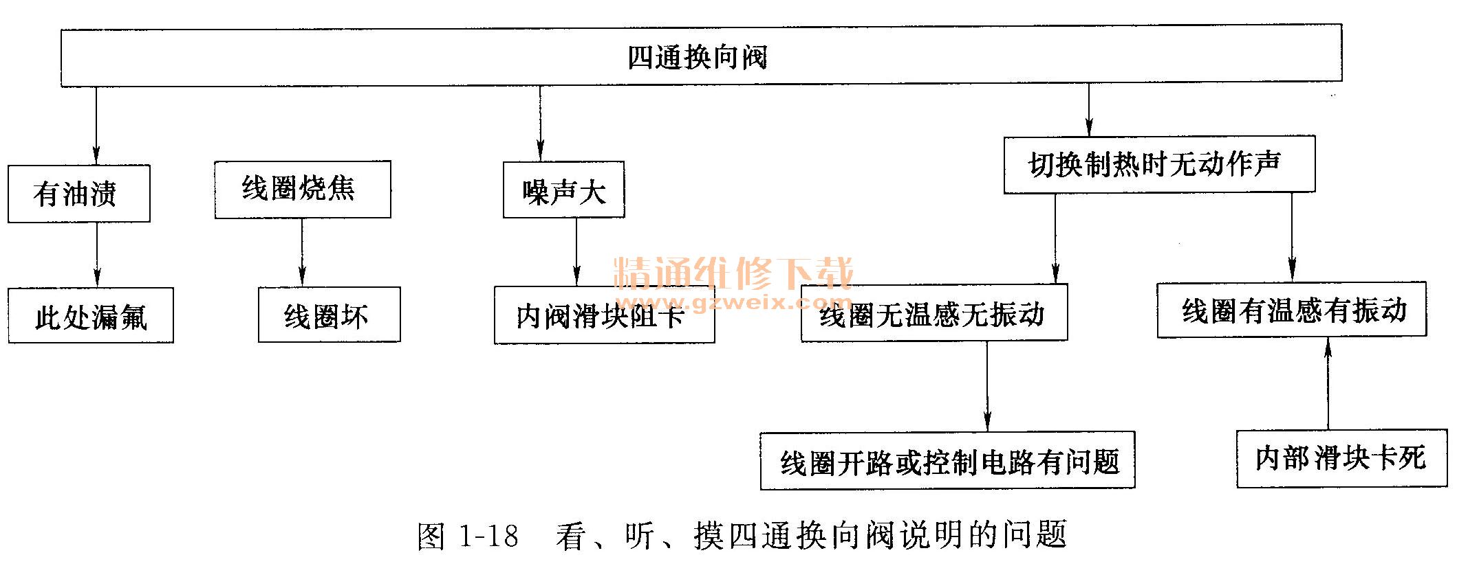 ②四通換向閥只有熱泵冷暖空調(diào)器才有(單冷機(jī)無),用于切換制冷劑在壓縮機(jī)外的管道走向,使壓縮機(jī)排出的高溫高壓制冷劑在制冷時(shí)先流經(jīng)室外熱交換器,在制熱時(shí)先流經(jīng)室內(nèi)熱交換器。看、聽、摸四通換向閥說明的問題如圖1-18所示。