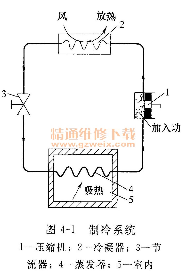 圖4-1所示是空調(diào)器的機(jī)械壓縮式制冷系統(tǒng)的工作原理,也是空調(diào)器的制冷基本工作原理。