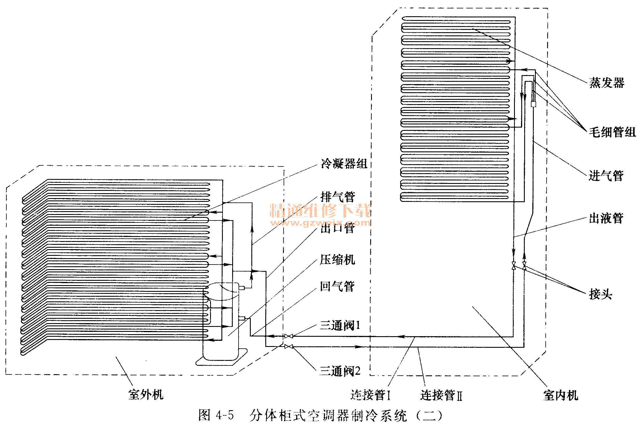 如圖4-3所示,由壓縮機(jī)、冷凝器、蒸發(fā)器、毛細(xì)管、三通閥、二通閥、低壓液體管(又稱高壓管、細(xì)連接管)、氣體管(又稱低壓管,粗連接管)等組成。從圖中可以看出,這種空調(diào)器較之窗式空調(diào)器增加三個器件,即二通閥、三通閥、室內(nèi)外機(jī)連接粗細(xì)管。