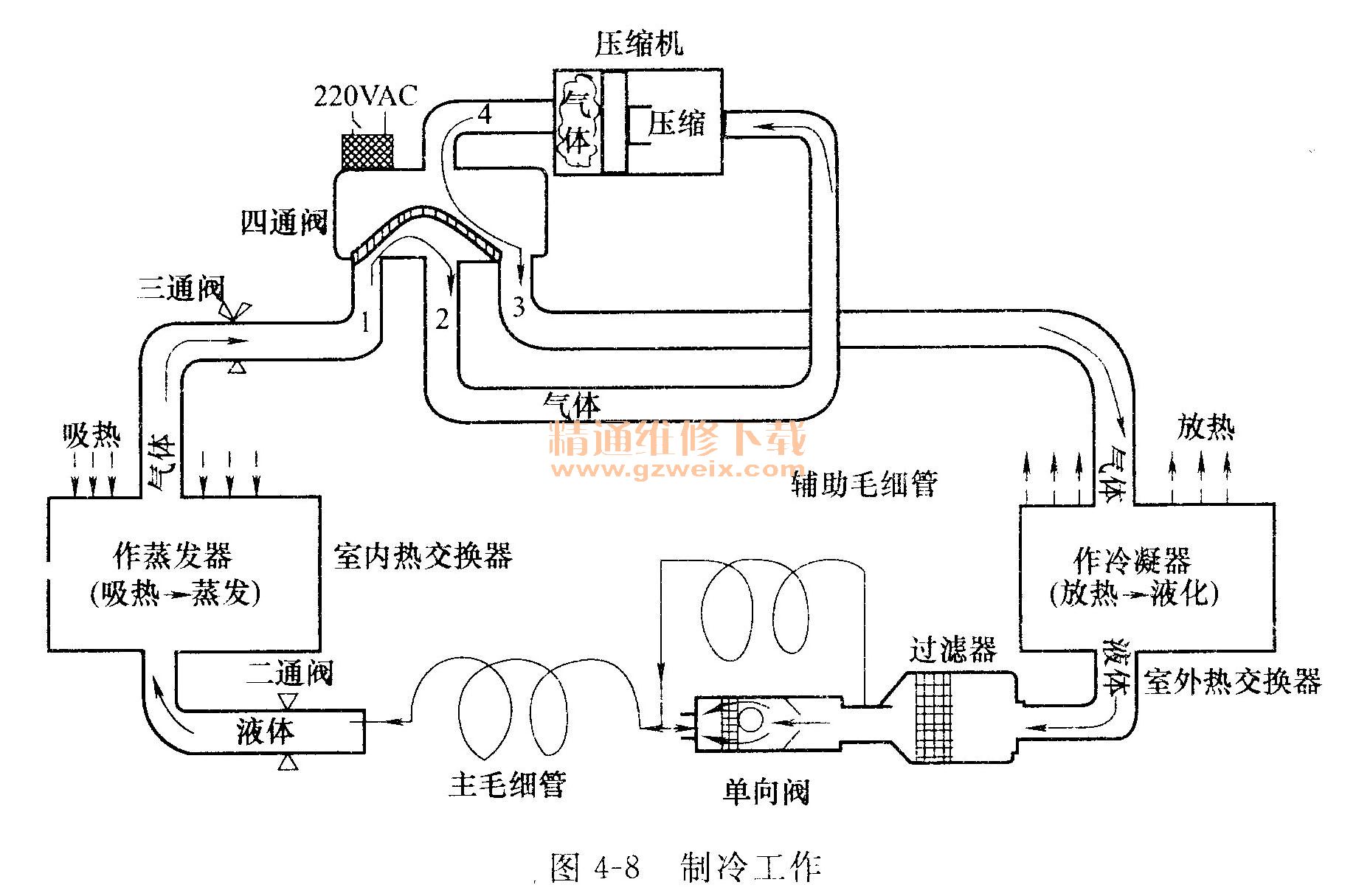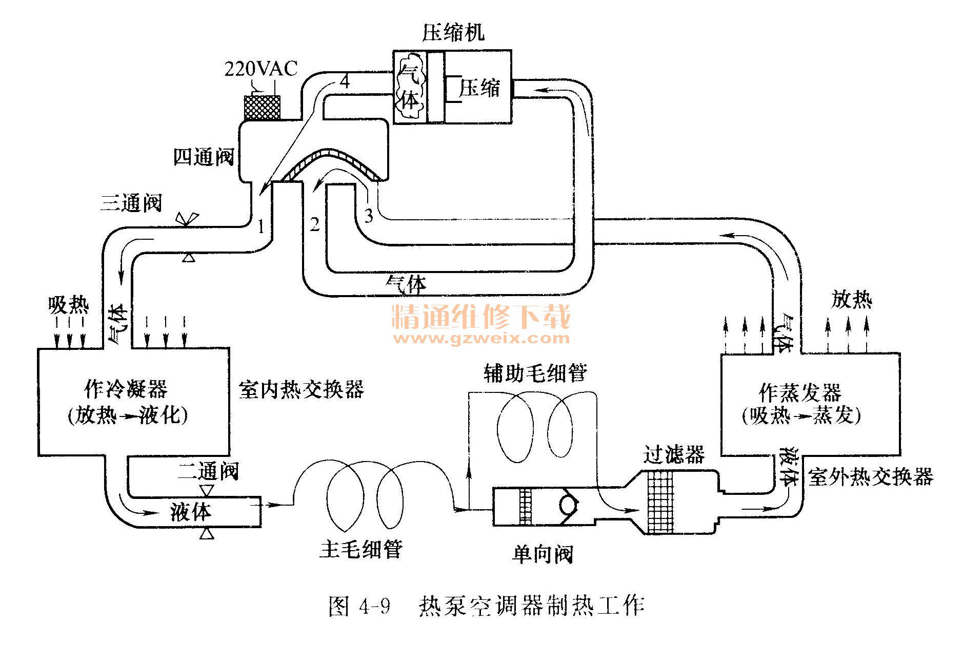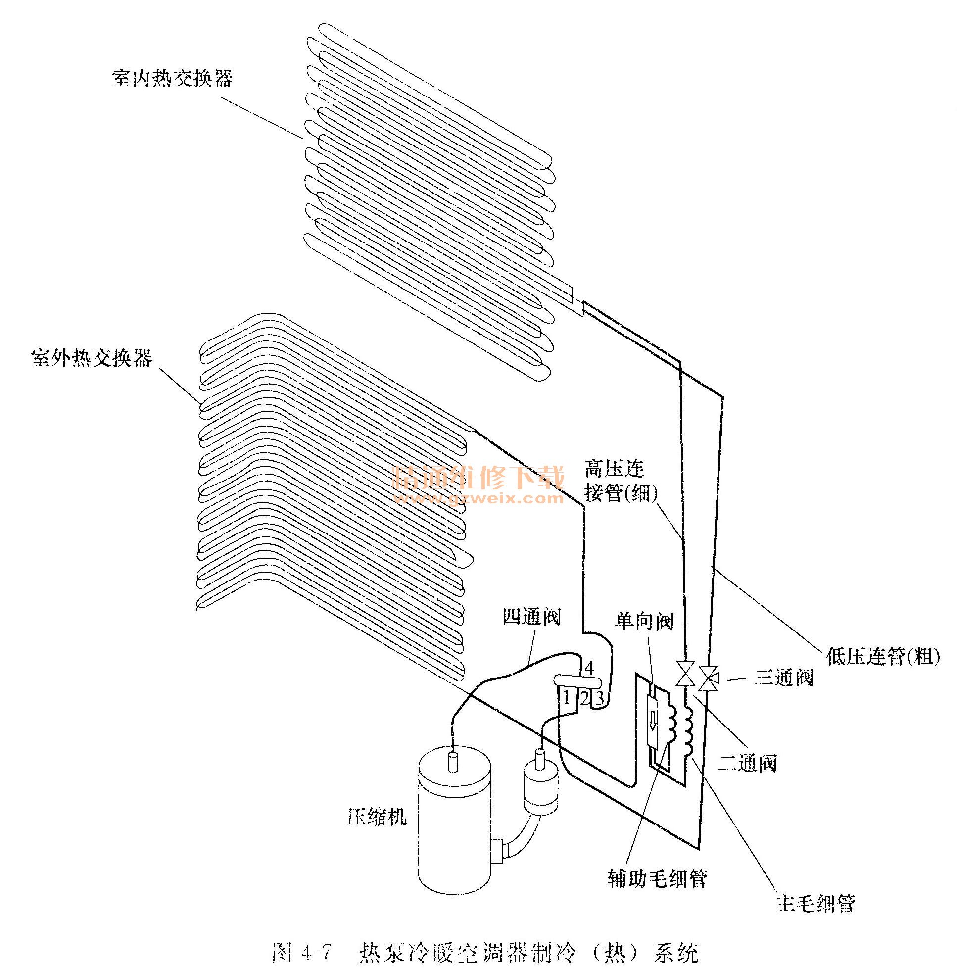 圖4-7所示是熱泵冷暖空調(diào)器的制冷(熱)系統(tǒng),由壓縮機(jī)、室外熱交換器、四通換向閥、主毛細(xì)管、輔助毛細(xì)管、單向閥、二通閥、三通閥、高/低壓連接管、室內(nèi)熱交換器等組成。