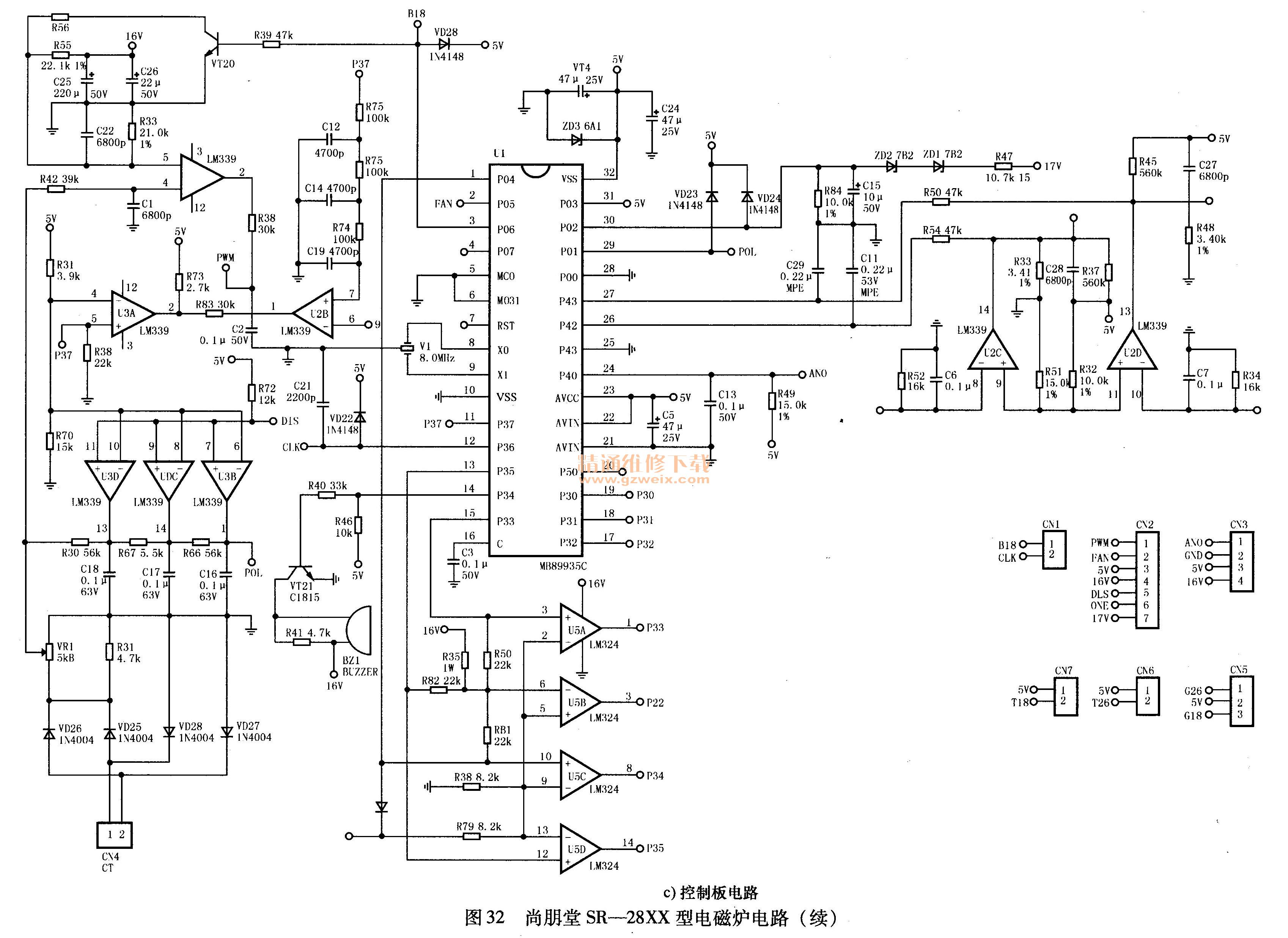 MB89935 C集成電路在尚朋堂SR-28XX型電磁爐上的應(yīng)用電路如圖32所示。