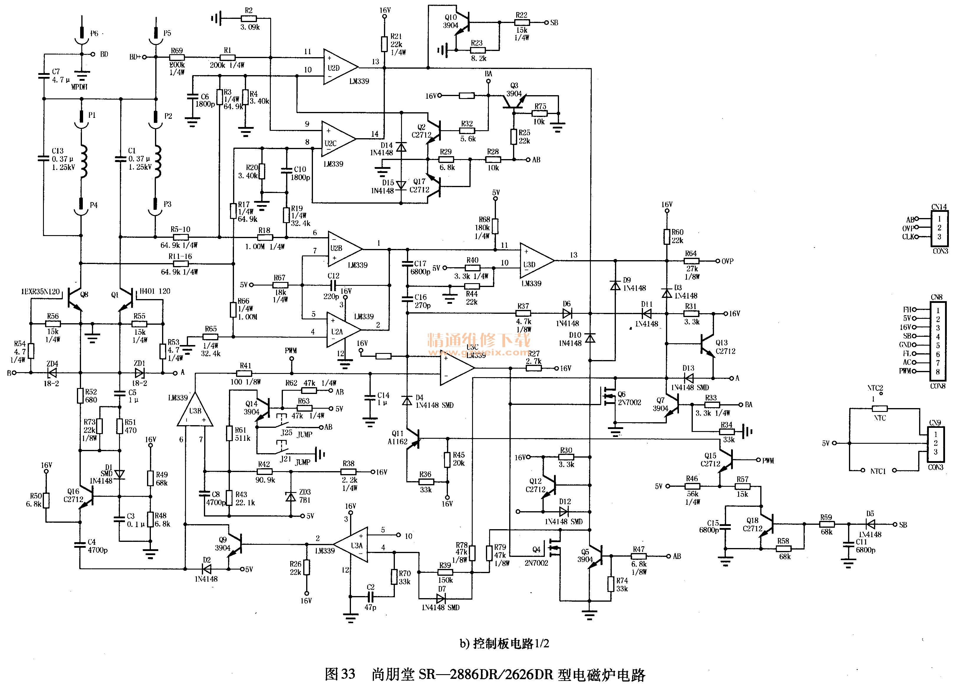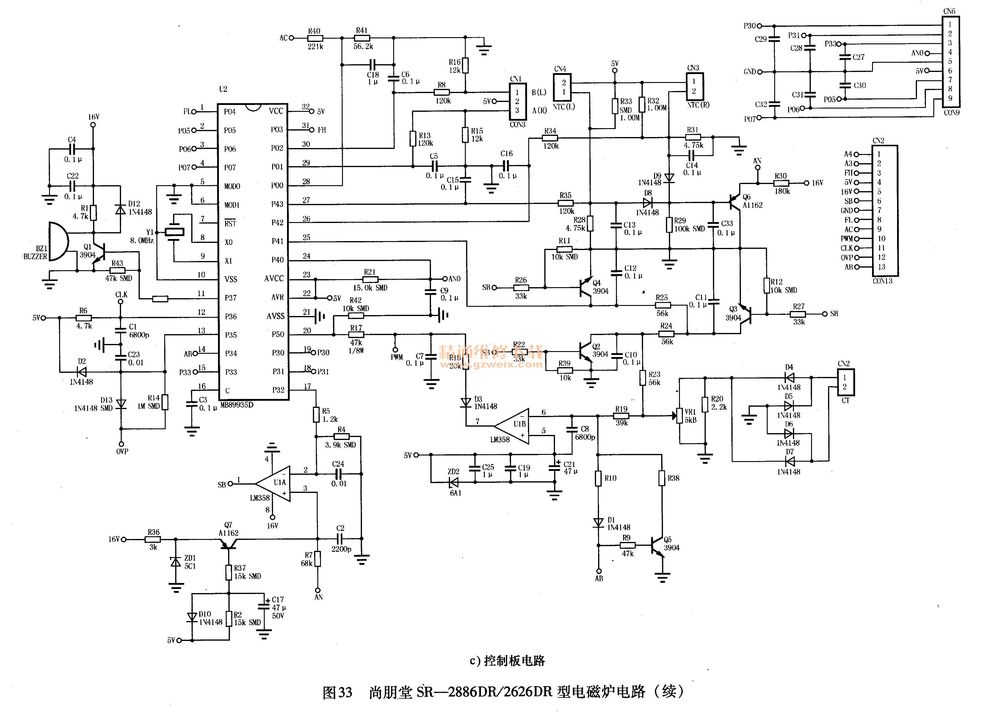 MB89935 D集成電路在尚朋堂SR 2886DR/2626DR型電磁爐上的應(yīng)用電路如圖33所示。