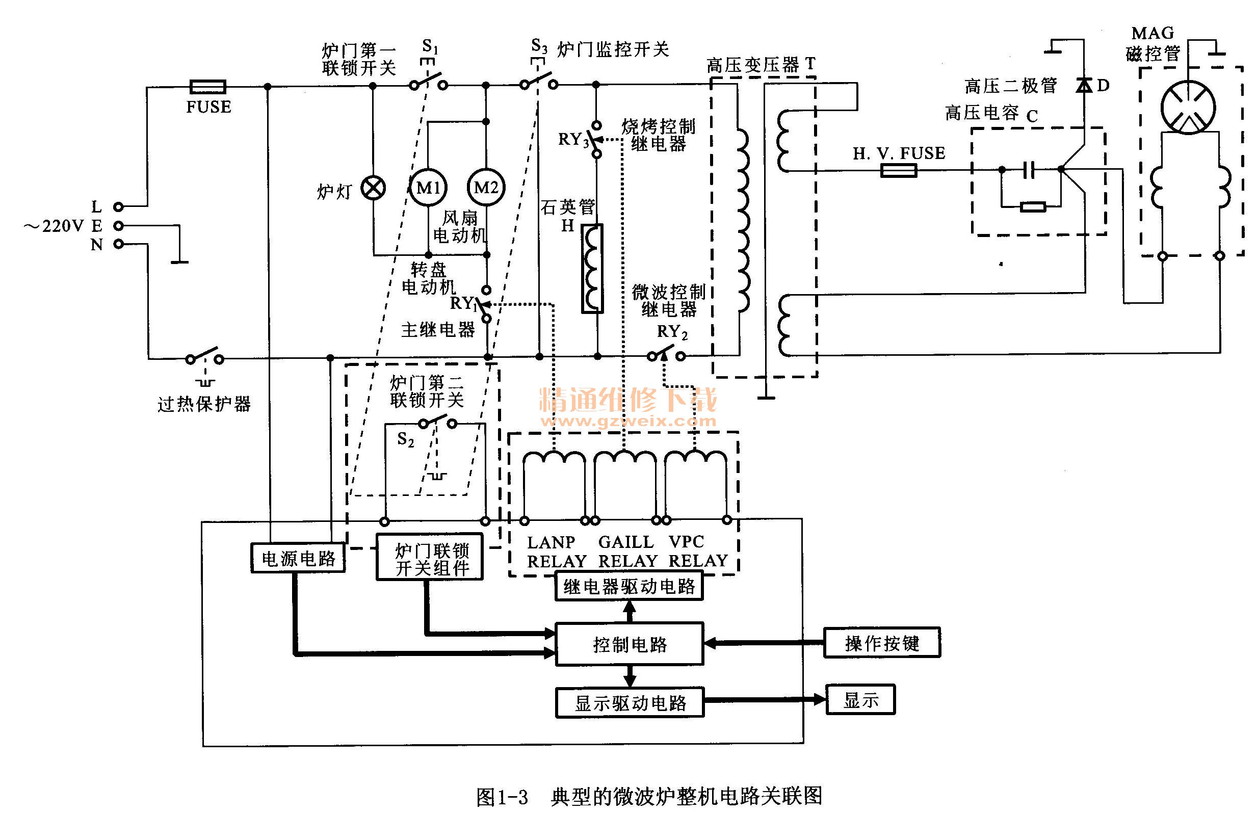 一個典型微波爐的整機電路結(jié)構(gòu)如圖1-3所示,控制給磁控管的斷續(xù)供電的時間比率,就可進行火力控制。將門聯(lián)開關(guān)盒過熱保護開關(guān)設(shè)置在交流220V的供電電路中,只要切斷供電微波爐就會停機從而可進行保護。