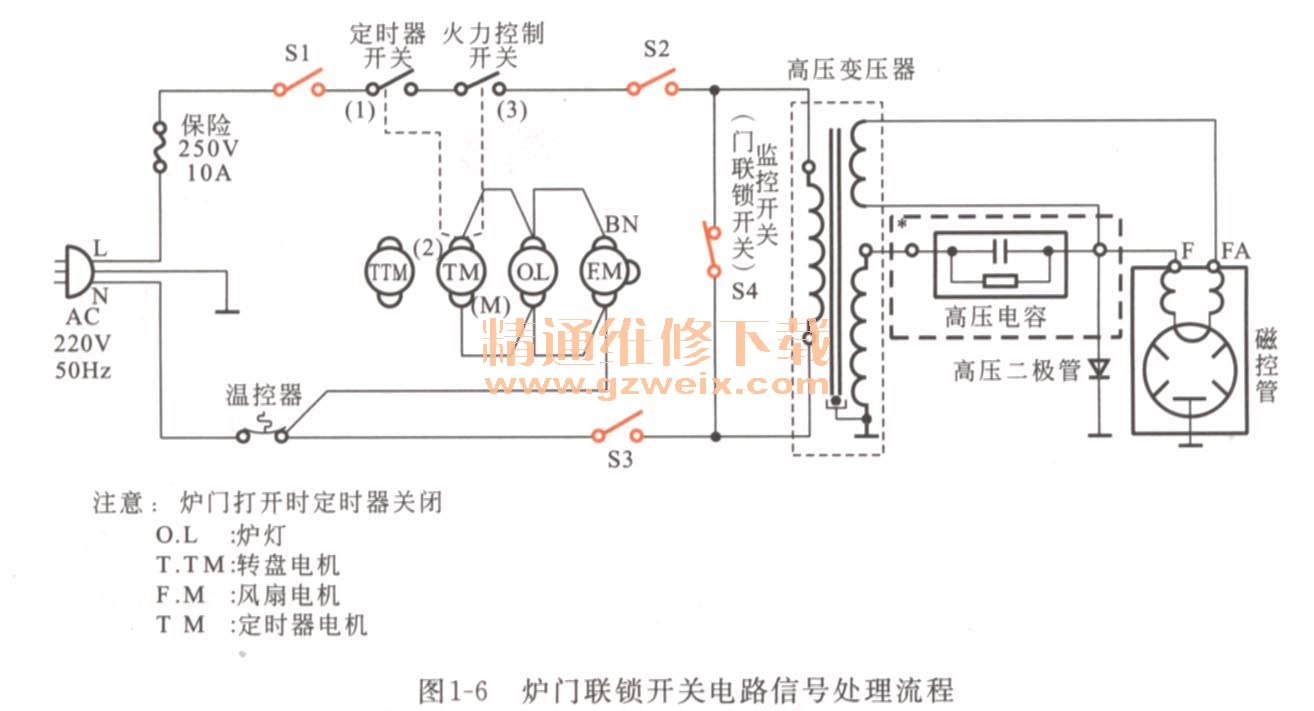 微波爐的爐門一旦被打開,門聯(lián)鎖開關(guān)S1、S2、S3開關(guān)便會在爐門的作用下,將微波爐的電路斷開,而監(jiān)控器開關(guān)S4則將高壓變壓器的輸入端短路,以防止門聯(lián)鎖開關(guān)失靈時,磁控管誤啟動。