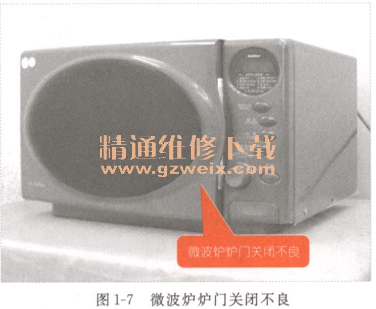 初查微波爐的故障,主要通過檢查微波爐的爐門關(guān)閉是否良好,微波爐中器件的連接是否良好。微波爐的爐門若關(guān)閉不良,微波爐無法正常工作,如圖1-7所示。