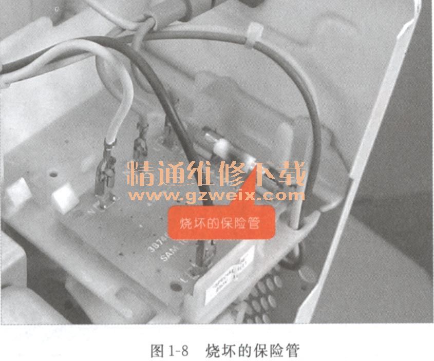 當(dāng)微波爐內(nèi)部出現(xiàn)過載故障時,很可能會引起內(nèi)部的某些元器件燒壞,此時,就需要通過嗅覺、視覺等感官直接觀察微波爐內(nèi)的元器件或電路板,是否有燒壞的保險管、電容是否漏液等現(xiàn)象,電阻是否有短路現(xiàn)象,變壓器是否有燒壞的現(xiàn)象等。如圖1-8所示,為燒壞的保險管。