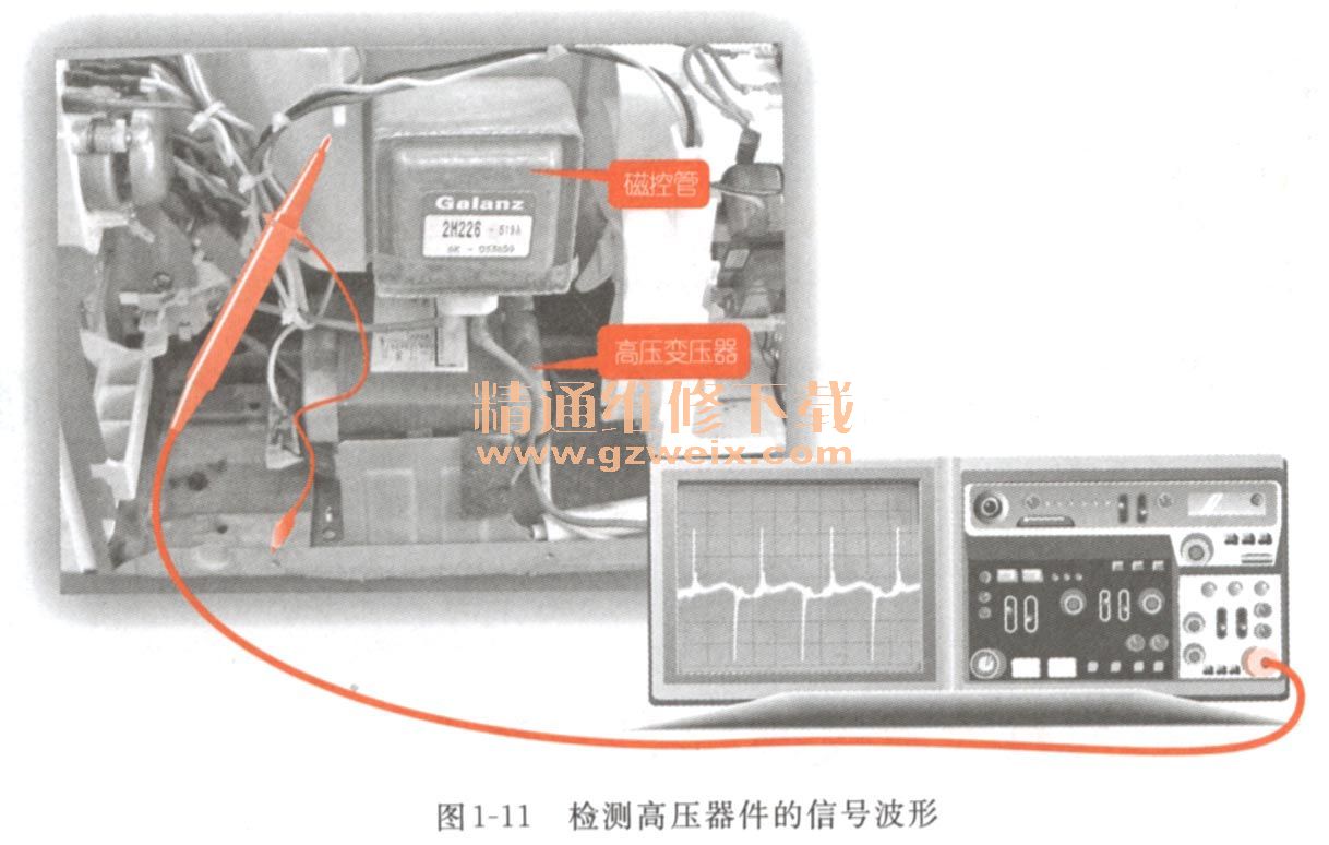 使用示波器檢測微波爐的高壓部分時,切忌將示波器探頭與高壓器件連接,應(yīng)采用感應(yīng)檢測方式,將示波器探頭靠近檢測部位,測量高壓器件的波形,如圖1-11所示。如波形失常則有故障存在。
