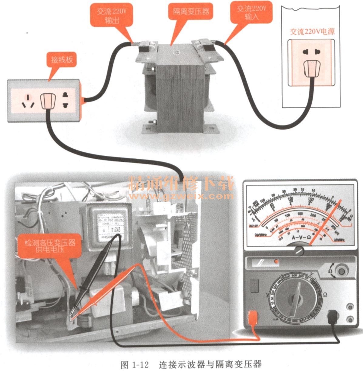 在檢測微波爐的過程中,不可避免地要對微波爐進行通電檢測,由于微波爐的電路中有高壓電路,在檢測時,若檢測的方法不正確或檢測失誤,很容易造成微波爐的二次損壞,甚至導(dǎo)致維修人員觸電事故的發(fā)生。因此,在對微波爐進行通電檢測前,應(yīng)將微波爐與隔離變壓器連接,如圖1-12所示。
