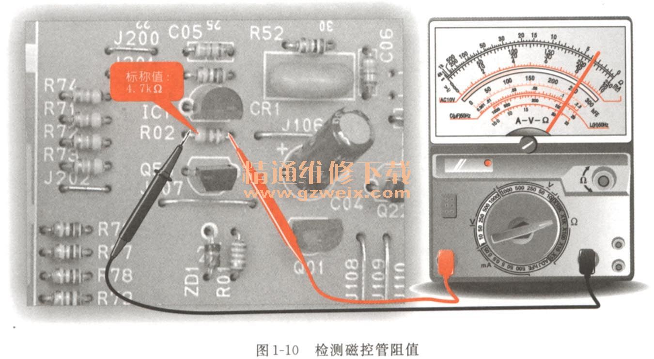 通過電阻檢測法可以直接檢測可疑器件的阻值,然后與正常情況下的阻值進行比較,大致判斷元器件的好壞,或判斷微波爐電路中是否存在短路和斷路情況。例如,如圖1-10所示,為采用電阻檢測法,檢測微波爐電路板上的色環(huán)電阻,通過檢測得出的阻值與色環(huán)識讀的數(shù)值相比較,若測量的值相差太大,則可初步判斷該電阻已經(jīng)損壞,更換為新的電阻即可。