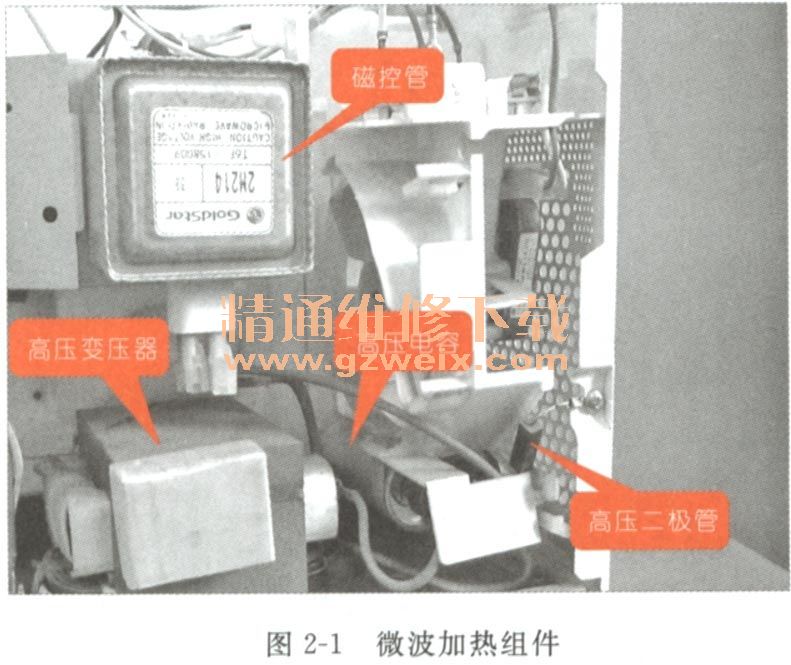 微波爐的微波加熱組件主要包括磁控管、高壓變壓器、高壓電容和高壓二極管等,如圖2-1所示。