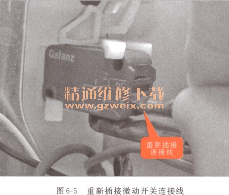(1)當(dāng)爐門連鎖開關(guān)組件出現(xiàn)故障時(shí),應(yīng)首先觀察微動(dòng)開關(guān)的連接線是否松動(dòng)或脫落,如圖6-5所示,將松動(dòng)的微動(dòng)開關(guān)的連接線進(jìn)行重新插接。