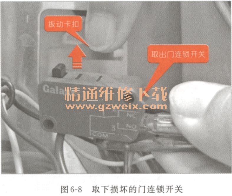 (5)向上扳動(dòng)門連鎖開關(guān)的固定卡扣,將損壞的門連鎖開關(guān)從微波爐上取下,如圖6-8所示。