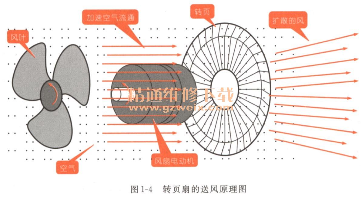 壁扇的送風原理如圖1-3所示,當風扇電動機高速旋轉(zhuǎn)的同時,會帶動風葉一起高速旋轉(zhuǎn),風葉的葉片是帶有一定角度的,旋轉(zhuǎn)就會切割空氣,從而促使空氣加速流通。