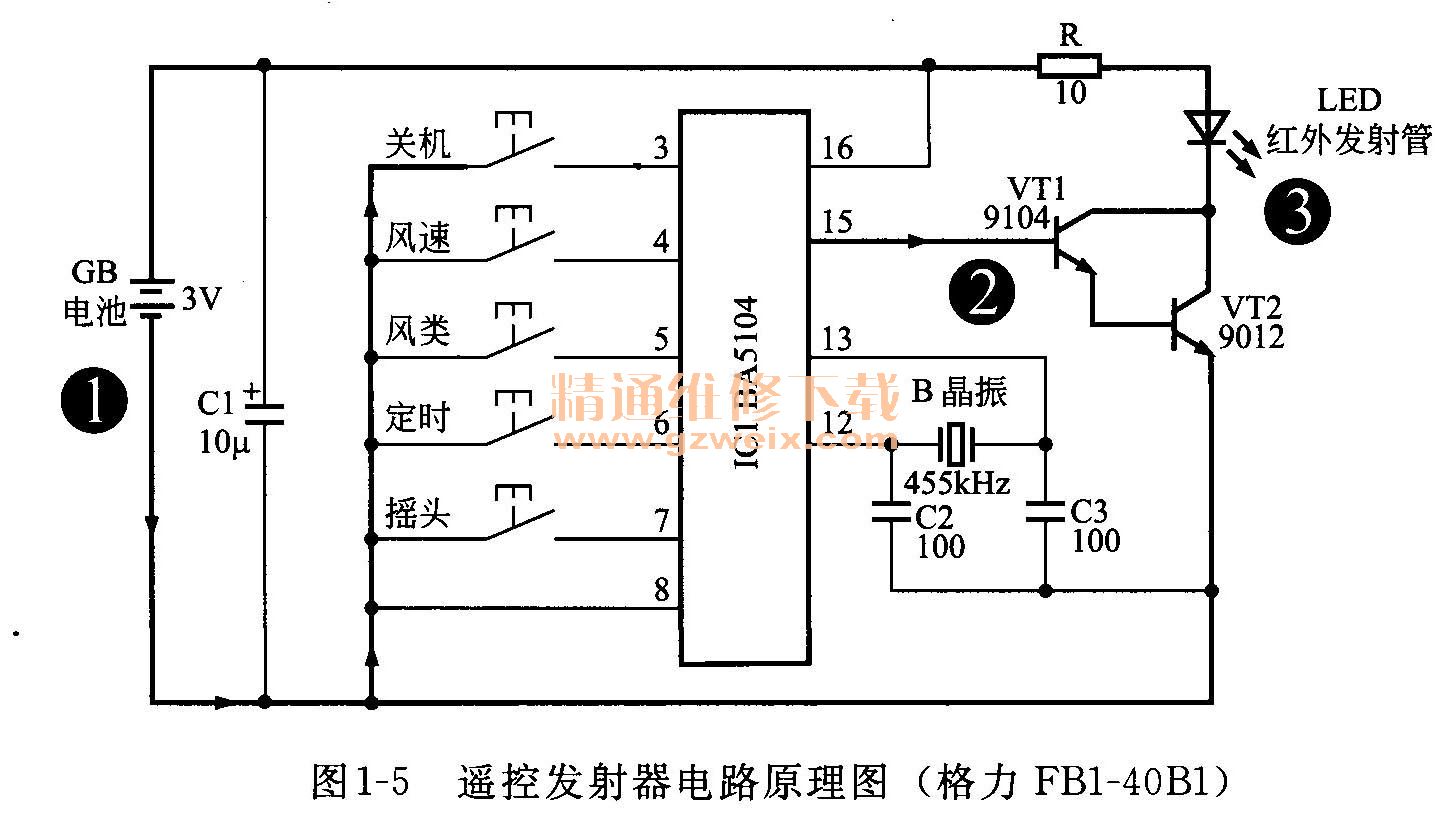 如圖1-5所示為電風扇的遙控發(fā)射器電路圖,它是由遙控信號的編碼調(diào)制控制芯片IC BA5104晶體和紅外發(fā)光二極管及驅(qū)動電路等部分構(gòu)成的。