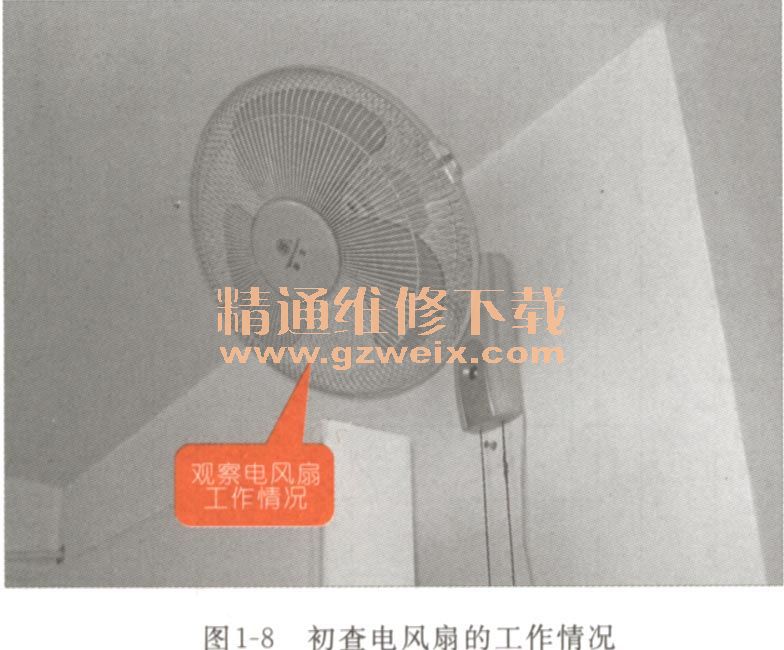初查電風扇的故障,主要通過觀察電風扇的工作情況,電風扇啟動后,觀察電風扇的風速旋轉(zhuǎn)過程,或搖頭擺動情況是否良好,如圖1-8所示。