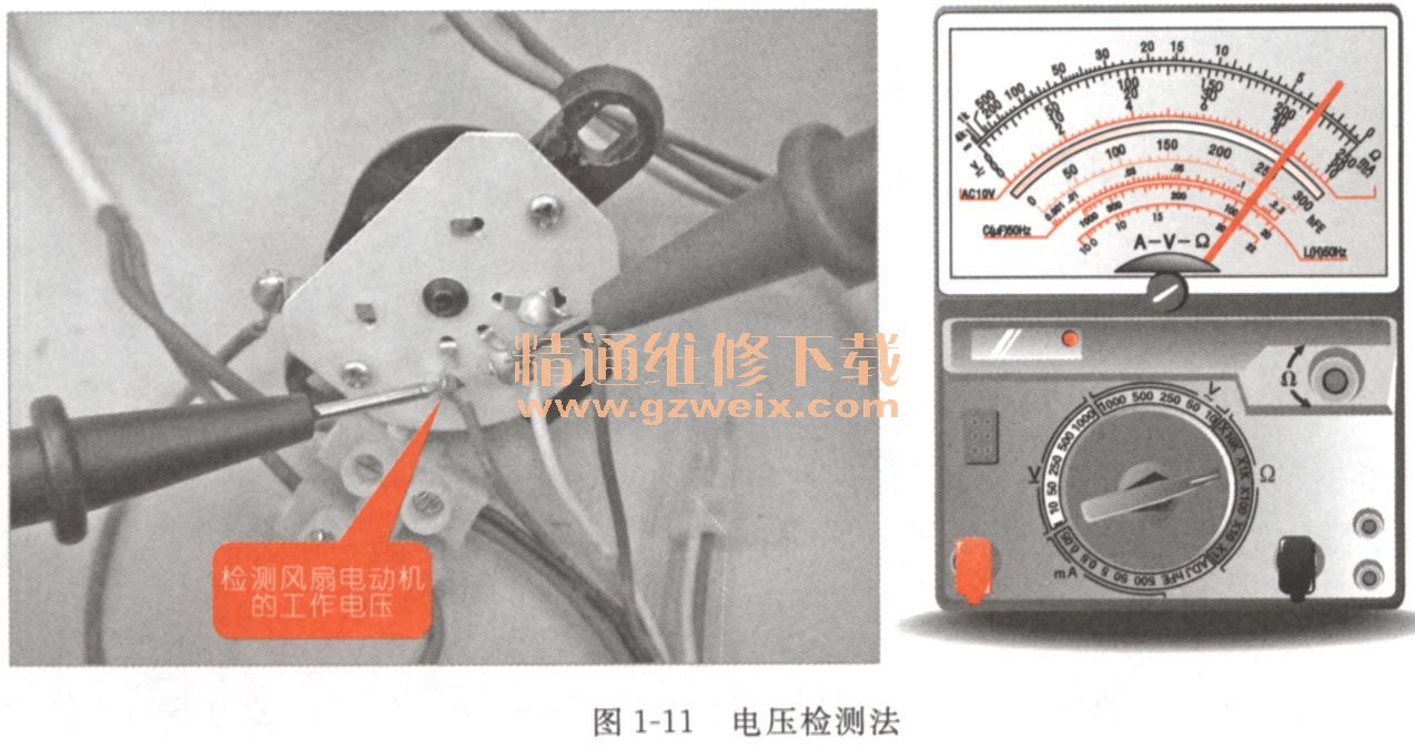 電壓檢測法主要是在通電狀態(tài),使用萬用表檢測關(guān)鍵點的電壓,將測量的電壓結(jié)果與電風扇正常情況下的數(shù)值比較,從而推斷出故障部位,最終找出故障元器件,進而排除故障,如圖1-11所示。