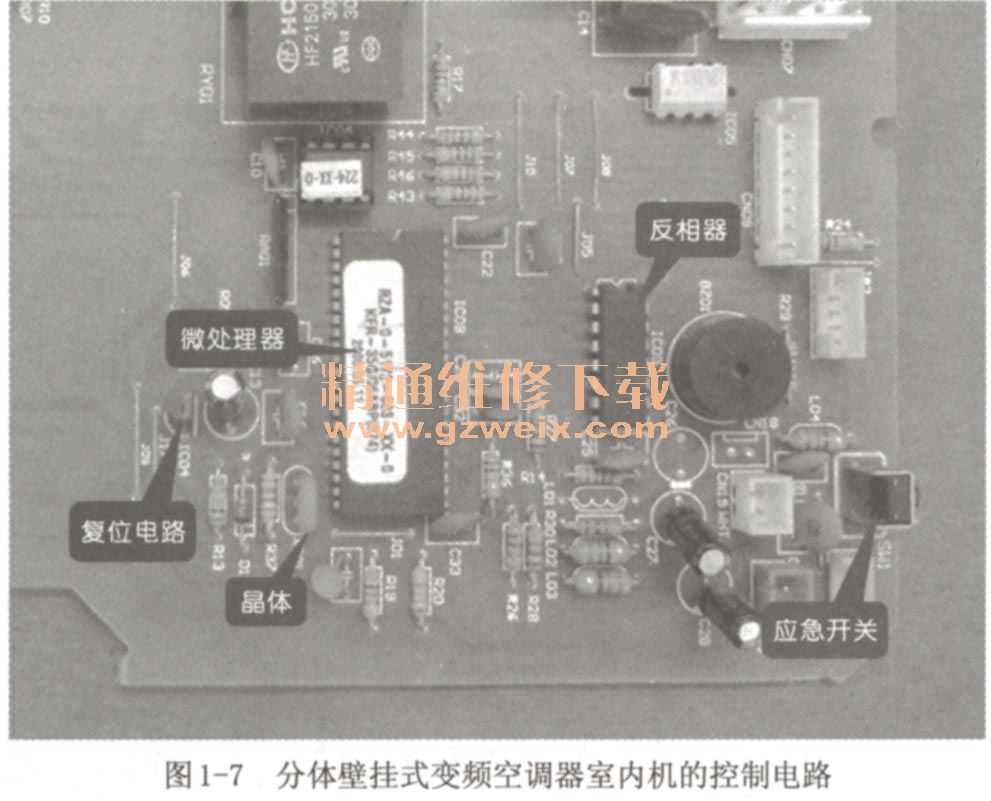 控制電路是分體壁掛式變頻空調(diào)器的核心控制部分,該電路主要由微處理器等元器件構(gòu)成的,其實(shí)物如圖1-7所示。