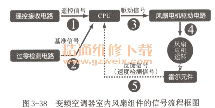 如圖3-38所示為變頻空調(diào)器室內(nèi)風(fēng)扇組件的信號(hào)流程框圖。1變頻空調(diào)器室內(nèi)機(jī)微處理器接收到遙控信號(hào)后,啟動(dòng)空調(diào)器開(kāi)始運(yùn)行。2同時(shí)過(guò)零檢測(cè)電路將基準(zhǔn)信號(hào)送入微處理器中。3然后,微處理器將驅(qū)動(dòng)信號(hào)送到室內(nèi)風(fēng)扇電機(jī)驅(qū)動(dòng)電路中,4由驅(qū)動(dòng)電路控制風(fēng)扇運(yùn)轉(zhuǎn),5風(fēng)扇電機(jī)運(yùn)轉(zhuǎn)后,霍爾元件將檢測(cè)的反饋信號(hào)(風(fēng)速檢測(cè)信號(hào))通過(guò)風(fēng)速檢測(cè)電路送到微處理器中,由微處理器控制并調(diào)整風(fēng)扇的轉(zhuǎn)速。