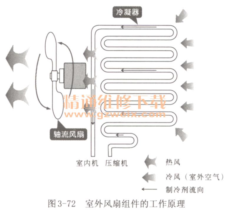 如圖3-72所示為室外風(fēng)扇組件的工作原理。室外風(fēng)扇運轉(zhuǎn)后,室外空氣會在扇葉的帶動下,將冷凝器散發(fā)的熱量帶走,加速冷凝器散熱。