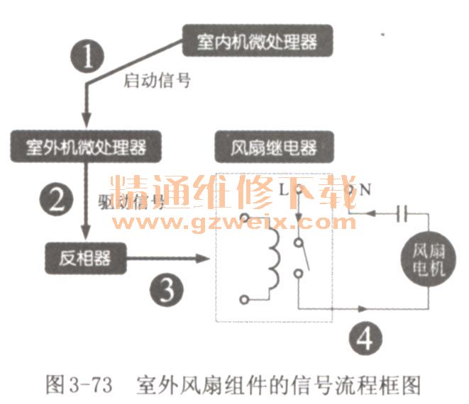 如圖3-73所示為室外風(fēng)扇組件的信號流程框圖。1變頻空調(diào)器啟動后,室內(nèi)機微處理器通過通訊電路向室外機微處理器發(fā)出啟動信號。2室外機微處理器接收到啟動信號后后,向反相器發(fā)出驅(qū)動信號,3由反相器控制繼電器工作。4繼電器導(dǎo)通后,便接通室外風(fēng)扇電機的供電電壓,室外風(fēng)扇開始運轉(zhuǎn)。
