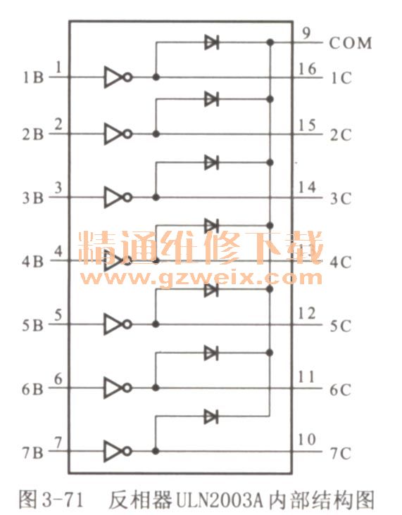 如圖3-71所示為反相器ULN2003A的內(nèi)部結(jié)構(gòu)圖。