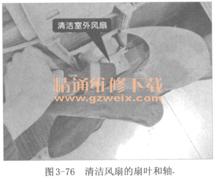 室外機風扇組件放置在室外,容易堆積大量的灰塵,若有異物進去極易卡住風扇扇葉,導致風扇運轉(zhuǎn)異常。檢修前,可先將風扇組件上的異物進行清理。如圖3-76所示,使用毛刷和抹布清理室外機的風扇組件。若風扇由于變形而無法運轉(zhuǎn),則需要對其進行更換,風扇的拆卸與代換方法可參見“室外機風扇組件的代換方法”。