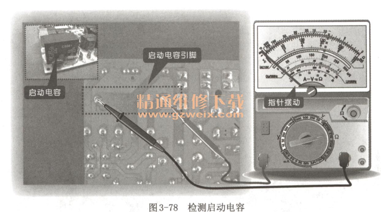 對于啟動電容的檢測,可使用萬用表對其充放電過程進行檢測,如圖3-78所示,將紅、黑表筆分別搭在啟動電容的兩個引腳上,這時表針向右擺動到最大角度后,接著文會逐漸向左擺回,然后停止在一個固定位置上,將表筆對換位置后進行檢測,發(fā)現(xiàn)仍然有充放電過程,說明該啟動電容正常。