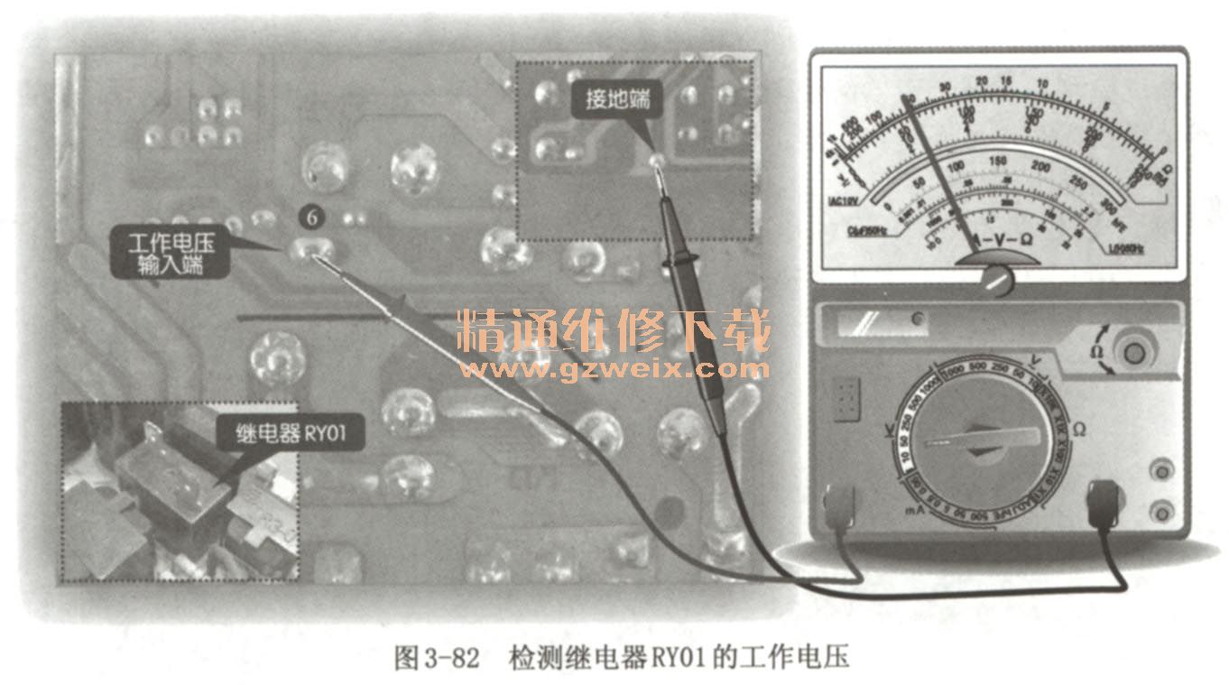 電壓輸入正常,應繼續(xù)對繼電器RY01和RY02的供電電壓進行檢測。將萬用表調(diào)至“DC 50V”電壓擋,黑表筆接地,紅表筆搭在繼電器RY01的⑥腳上,如圖3-82所示。正常情況下,可檢測到12V電壓。然后,黑表筆接地,紅表筆搭在繼電器RY02的①腳上,如圖3-83所示。正常情況下,也可以檢測到12V電壓。若檢測出的電壓異常,說明室外機的電源電路發(fā)生故障。