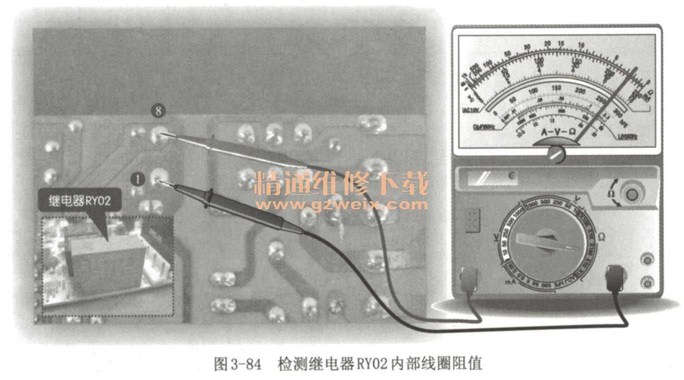 繼電器工作電壓正常,可使用萬用表對繼電器的內(nèi)部線圈進行檢測。將萬用表調(diào)至“×100”歐姆擋,紅、黑表筆任意搭在繼電器RY02的①腳、⑧腳上,如圖3-84所示。經(jīng)檢測,可測得阻值為250Ω左右,在路檢測繼電器時,會受到其他元器件干擾,可將繼電器焊下后,進行開路檢測,來判斷繼電器是否損壞。