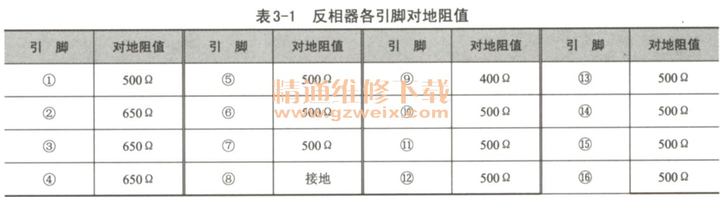 對于反相器的檢測,可使用萬用表對其各引腳的對地阻值進行檢測。將萬用表調(diào)至“×100”歐姆擋,黑表筆搭在反相器的⑧腳上(接地端),紅表筆搭在其余各引腳上,如圖3-85所示。具體檢測結(jié)果參見表3-1。若檢測出的阻值與正常值偏差較大,說明該反相器已損壞,需進行更換。