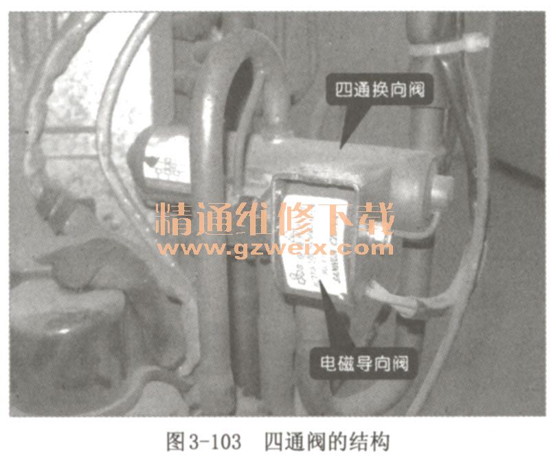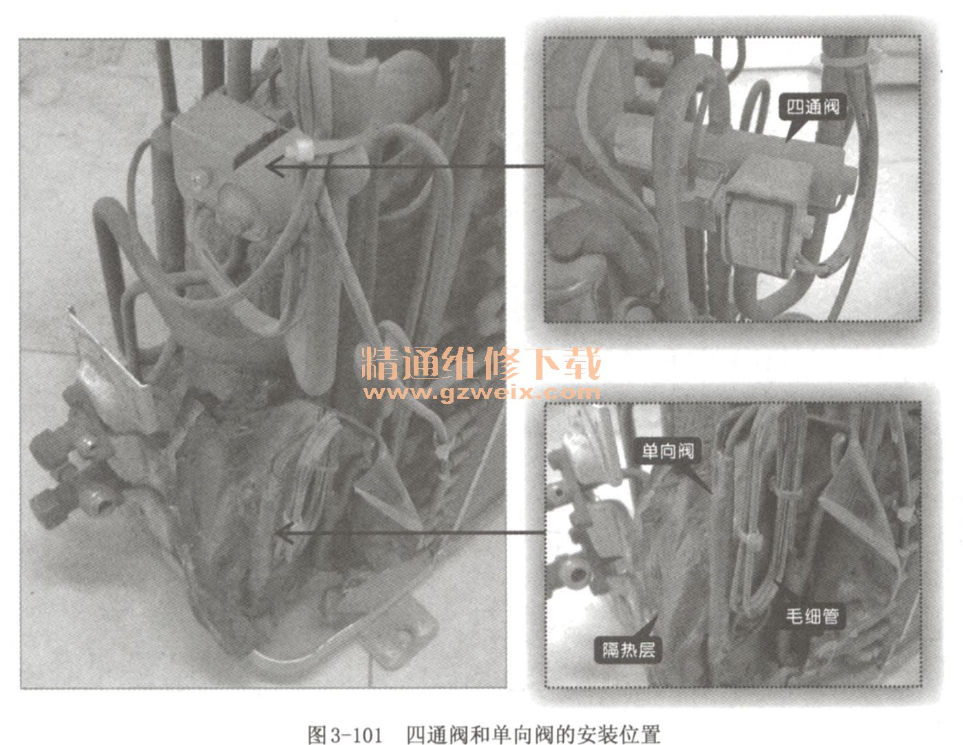 拆開變頻空調(diào)器的室外機(jī),在室外機(jī)的管路部分可找到四通閥和單向閥,如圖3-101所示。四通閥安裝在室外管路的上部,它有四根管口與制冷管路相連;單向閥與毛細(xì)管相連,由隔熱層保護(hù)。