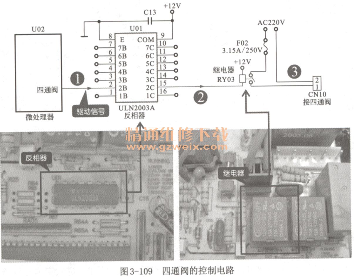 在變頻空調(diào)器中,四通閥的線圈供電是由微處理器控制的,微處理器的控制信號(hào)經(jīng)過反相放大器后去驅(qū)動(dòng),再由繼電器控制四通閥的供電。圖3-109是四通閥的控制電路。1室外機(jī)微處理器U02輸出控制信號(hào),送入反相器U01(ULN2003A)的②腳,由其送入反相器中。2反相器放大的控制信號(hào),由其15腳輸出,使繼電器RY03工作。母通過繼電器的觸點(diǎn)是控制四通閥的供電電壓,從而對(duì)電磁導(dǎo)向閥閥芯的位置進(jìn)行控制。