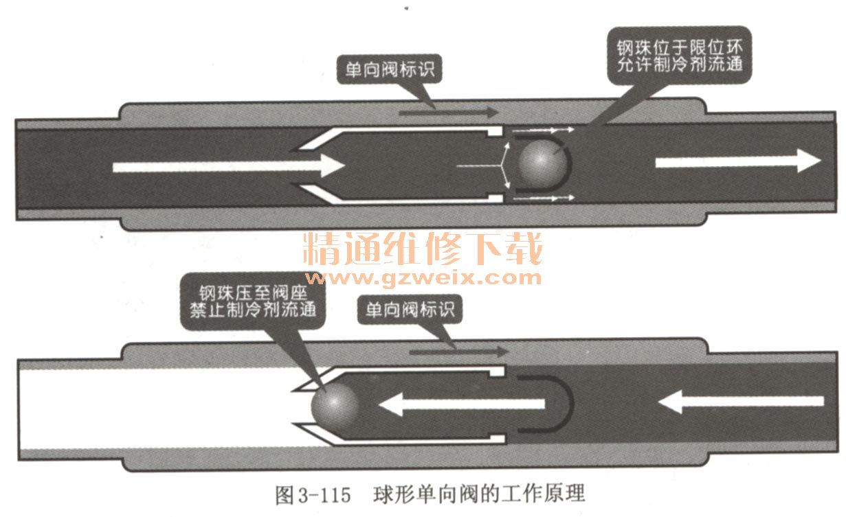 如圖3-115所示為球形單向閥的工作原理。當(dāng)制冷劑流向與球形單向閥標(biāo)識(shí)一致時(shí),鋼球被制冷劑推到限位環(huán)內(nèi),單向閥導(dǎo)通,允許制冷劑流過;當(dāng)制冷劑流向與標(biāo)識(shí)不一致時(shí),鋼球被制冷劑推到閥座上,單向閥截止,不允許制冷劑流過。