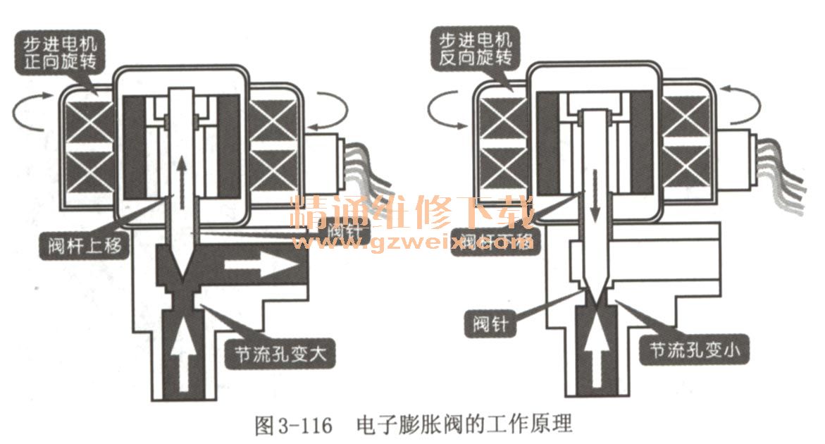 如圖3-116所示為電子膨脹閥的工作原理。微處理器根據(jù)蒸發(fā)器出口的溫度,來控制電子膨脹閥的步進(jìn)電機(jī)運(yùn)轉(zhuǎn),驅(qū)動(dòng)電機(jī)正轉(zhuǎn)或反轉(zhuǎn)。當(dāng)步進(jìn)電機(jī)正轉(zhuǎn)時(shí),閥桿向上移動(dòng),節(jié)流孔變大,制冷劑流量增大;當(dāng)步進(jìn)電機(jī)反轉(zhuǎn)時(shí),閥桿向下移動(dòng),節(jié)流孔變小,制冷劑流量減小。