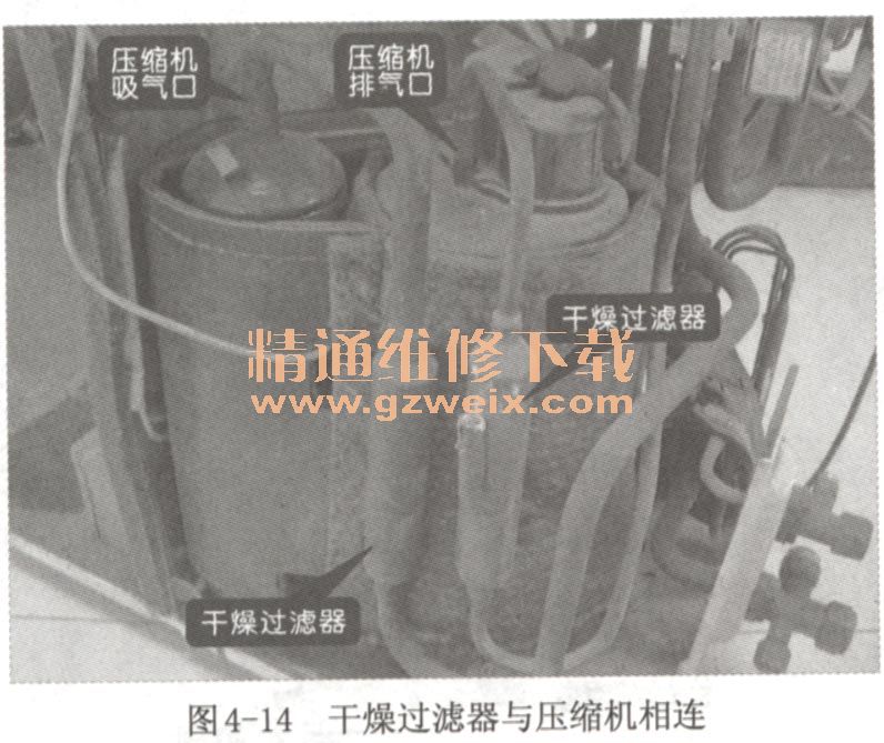 在某些空調器室外機中,干燥過濾器會與壓縮機的吸氣口和進氣口相連,如圖4-14所示。
