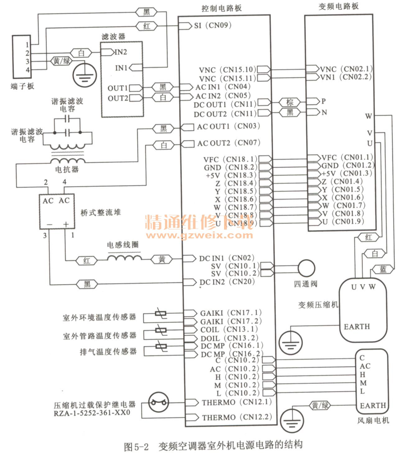 如圖5-2所示為變頻空調(diào)室外機電源電路,在整機結(jié)構(gòu)中的連接位置。