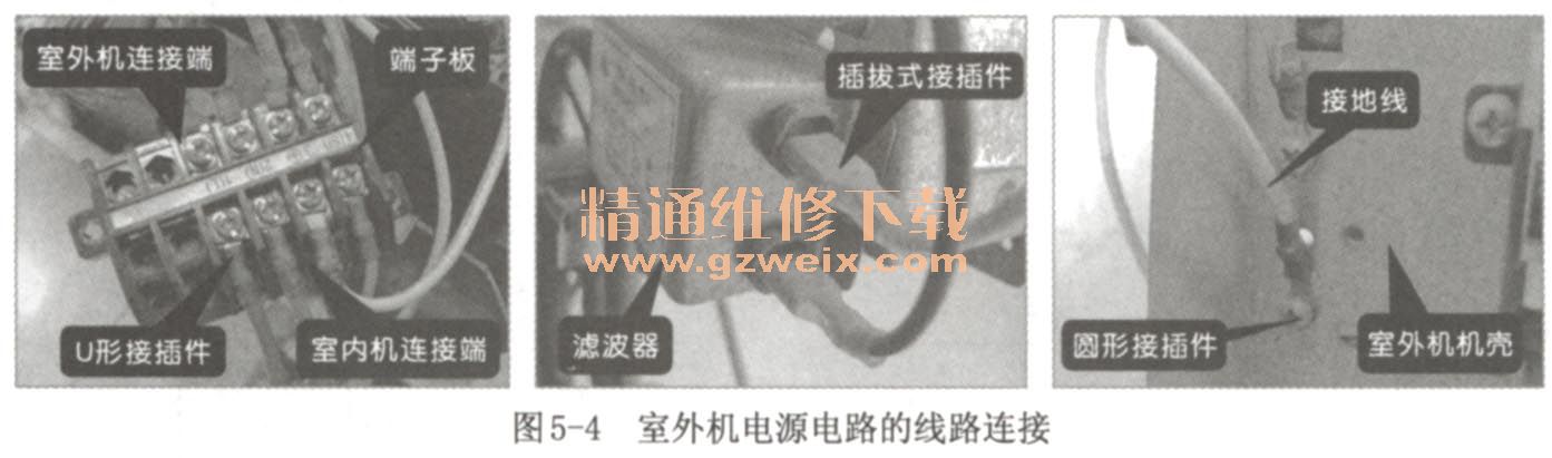 室外機電源電路中,主要采用U形接插件與端子板連接;直接插拔式接插件與電路板、濾波器等交直流接口或元器件相連;并通過圓形接插件接地,通常可在端子板或機器金屬支架上找到,如圖5-4所示。