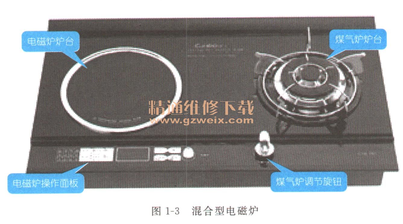 為了適應家庭廚房多樣性的需求,許多電磁爐生產(chǎn)廠商還推出了電磁爐與煤氣灶合二為一的混合型電磁爐,即將電磁爐與煤氣灶制成一體,一邊是電磁爐爐臺,一邊是煤氣爐爐臺,如圖1-3所示。