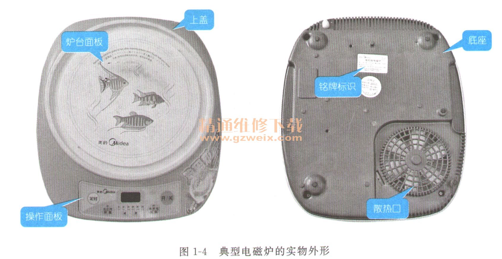 從外觀上來看,電磁爐主要是由上蓋、爐臺面板、操作面板、底座、散熱口、銘牌標識等部分構成的,如圖1-4所示為典型電磁爐的實物外形。