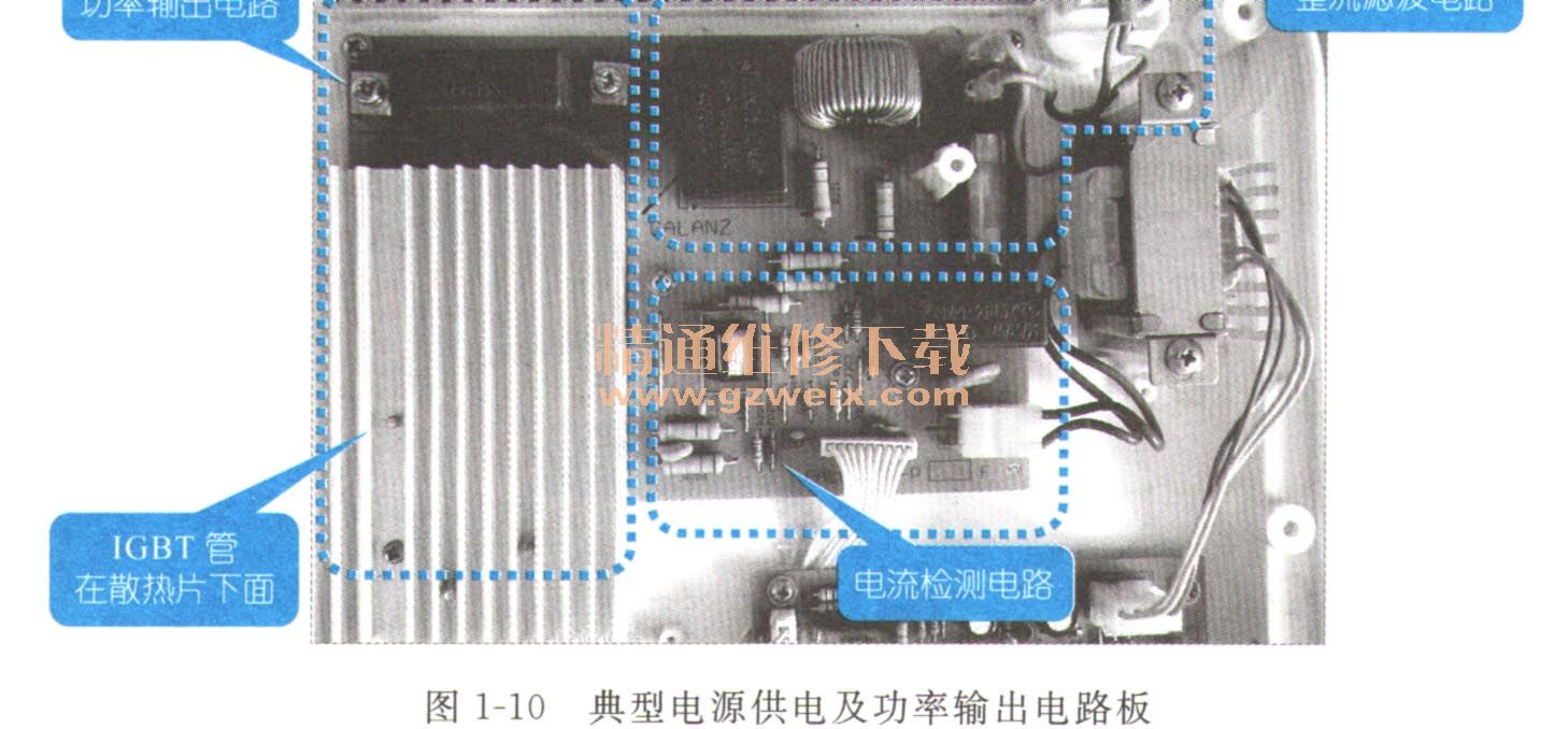 (1)電源供電及功率輸出電路板主要包括:市電輸入和整流濾波電路、電流檢測電路、功率輸出電路等,如圖1-10所示為典型電源供電及功率輸出電路板。其主要功能是將AC 220V市電提供的電能直接經(jīng)高壓整流濾波電路(如:橋式整流電路、濾波電容等)生成DC 300V電壓送入功率輸出電路,由IGBT管(門控管)、爐盤線圈、諧振電容形成高頻高壓的脈沖電流,與鐵質炊具進行熱能轉換。由于該電路板工作的功率較大,因此設有電流檢測、電壓檢測等監(jiān)控電路,以確保電磁爐中的重要元器件不被損壞。