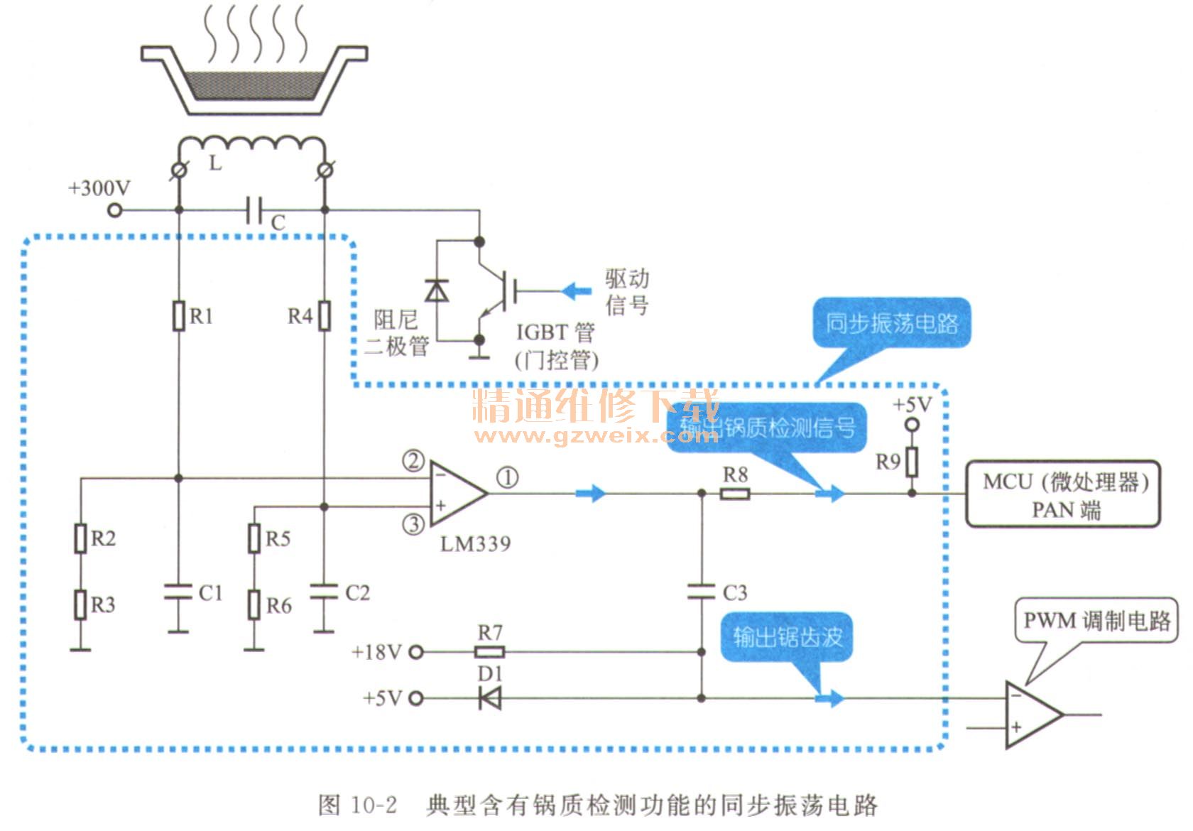 (1)如圖10-2所示為典型含有鍋質(zhì)檢測功能的同步振蕩電路,該電路是由一個電壓比較器構(gòu)成,通過對爐盤線圈L輸入端與輸出端的電壓,進行比較,從而得到控制電磁爐的同步信號和鍋質(zhì)檢測信號。