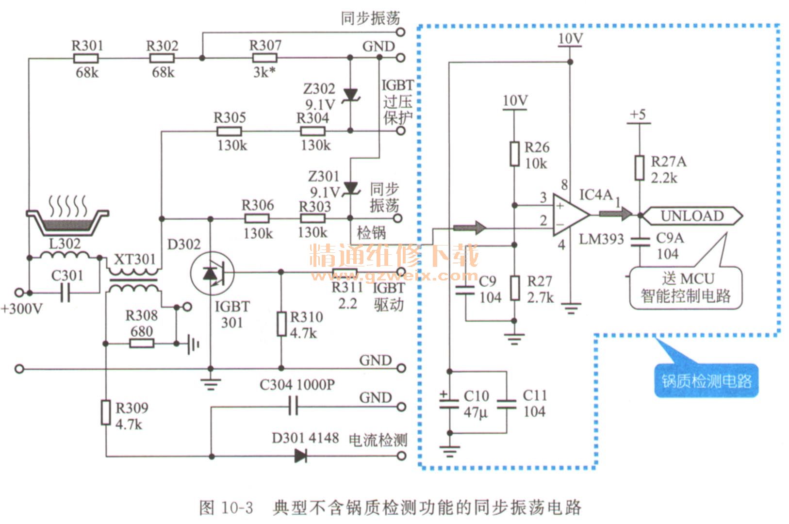 (2)如圖10-3所示為典型不含鍋質(zhì)檢測功能的同步振蕩電路,該電磁爐另有鍋質(zhì)檢測電路,分別由2個電壓比較器構(gòu)成,也是通過對爐盤線圈L輸入端與輸出端的電壓進行比較,從而控制電磁爐的同步信號。