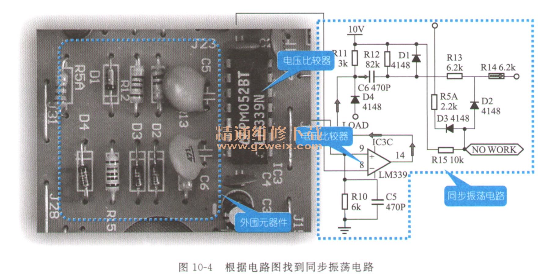 電磁爐需要同步振蕩電路保持IGBT驅(qū)動信號和LC諧振電路的同步,使其能夠穩(wěn)定的工作。對電磁爐中的同步振蕩電路進行查找時,在其電路板中很難確定該電路的準確部位,可通過在其電磁爐對應(yīng)的圖紙中進行查找,查找出該電路所包含的元器件后,再與電路板上的元器件進行對應(yīng),即可確定該電路中的元器件,典型電磁爐的具體查找方法如圖10-1所示。