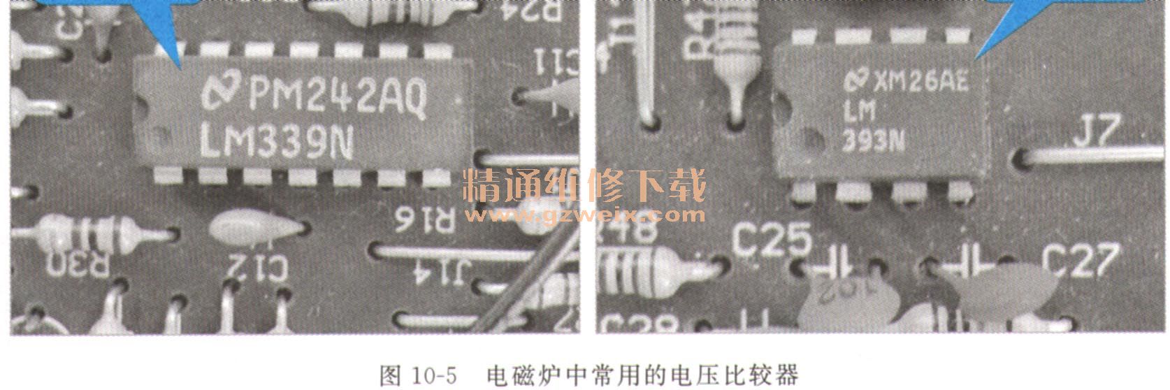 電磁爐中常用的電壓比較器有2種,如圖10-5所示,分別為LM339和LM393。其中LM339內(nèi)部有4個相同的電壓比較器,因此又被稱為四電壓比較器;而LM393內(nèi)部有2個形同的電壓比較器,因此又被稱為雙電壓比較器。