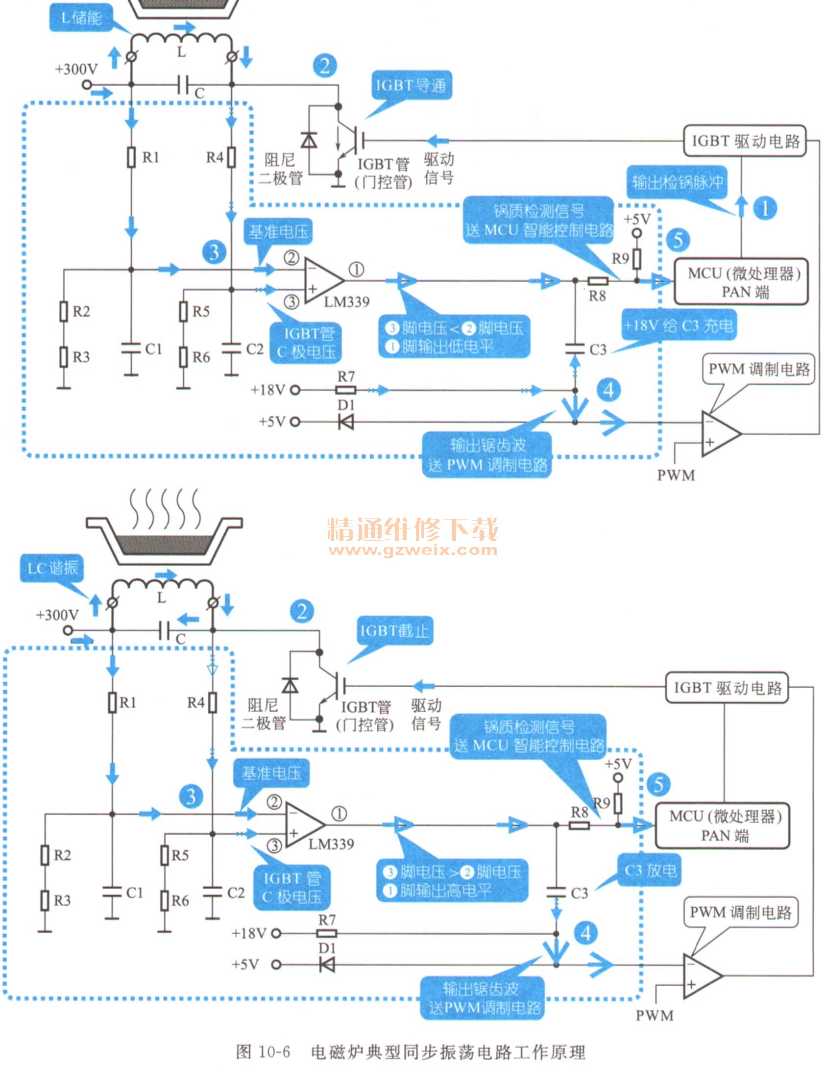 3.當IGBT管(門控管)處于導(dǎo)通狀態(tài)時,+300V電壓經(jīng)爐盤線圈L和IGBT管(門控管)形成回路,當IGBT管(門控管)截止時,爐盤線圈L的電流給高頻諧振電容充電,電路成高頻諧振狀態(tài)。爐盤線圈輸入端分壓送入電壓比較器的②腳,作為基準電壓;爐盤線圈輸出端(IGBT管C極)分壓送入電壓比較器的③腳,作為比較電壓。此時由于IGBT管(門控管)導(dǎo)通,因此②腳電壓小于③腳電壓,電壓比較器①腳輸出高電平。