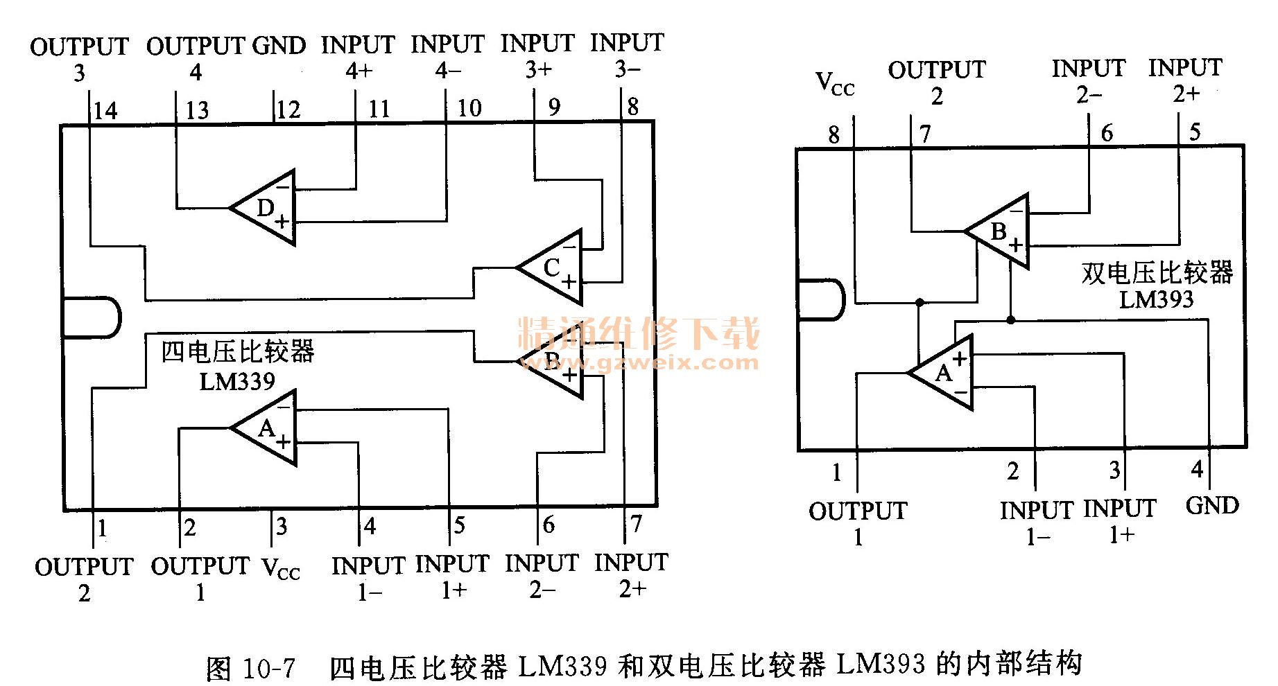 通過對電磁爐電路圖紙的分析,發(fā)現(xiàn)很多電路都是由電壓比較器構(gòu)成的,如圖10-7所示為四電壓比較器LM339和雙電壓比較器LM393的內(nèi)部結(jié)構(gòu)圖。