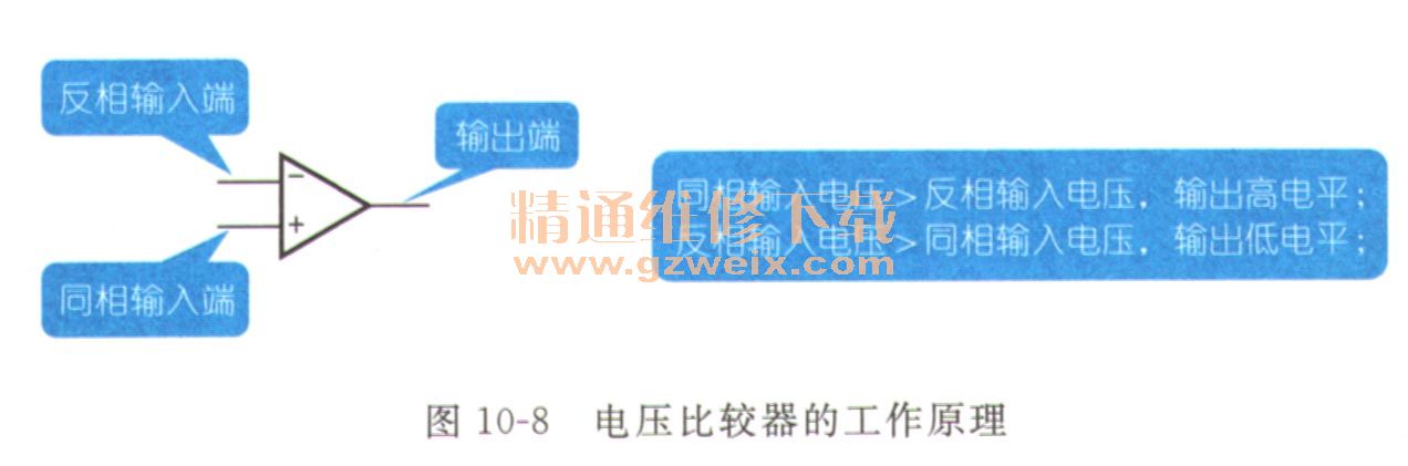 電壓比較器的工作原理如圖10-8所示,當正相輸入電壓高于反相輸入電壓時,輸出為高電平;當反相輸入電壓高于正相輸入電壓時,輸出為低電平。