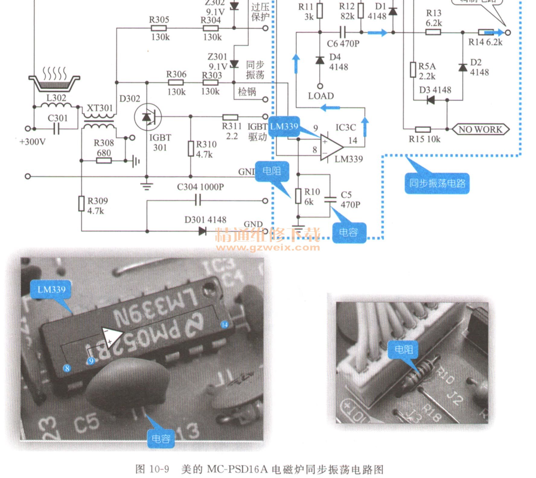 如圖10-9所示為美的MC-PSD16A電磁爐同步振蕩電路圖,爐盤線圈和IGBT管C極送來的電壓值分別送入IC3C(LM339)的⑧和⑨腳,由14腳輸出。